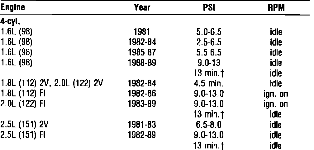 All models with TBI, pressure measured at fuel inlet of TBI unit.