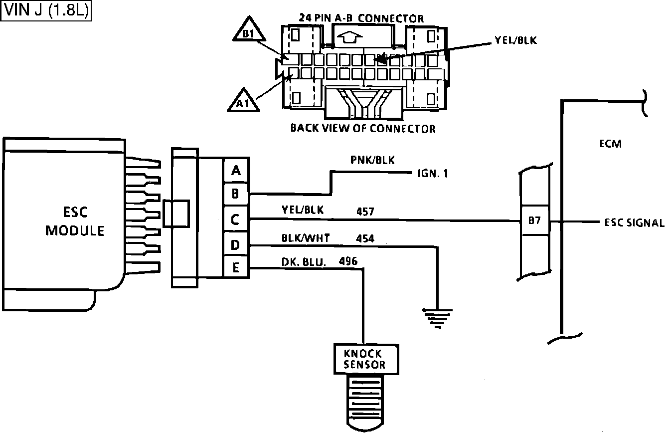 3. By disconnecting the ESC module, the ECM sees low voltage at Terminal "B7 " and should retard timing. After approximately 4 seconds, "SERVICE ENGINE SOON" light will come "ON" and Code 43 will be stored.