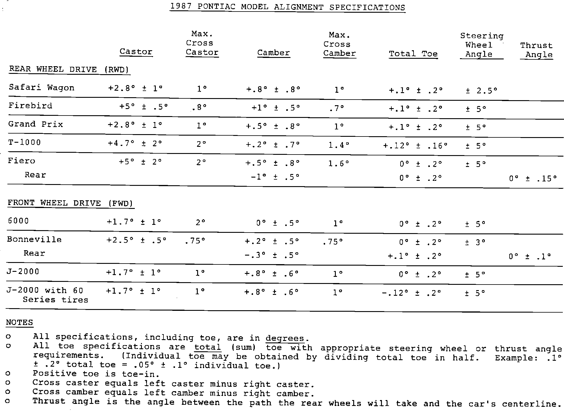 Alignment specifications for all 1987 models are being published here due to some recent specification changes. Many of the recent changes have been reductions in toe for improved tire wear.