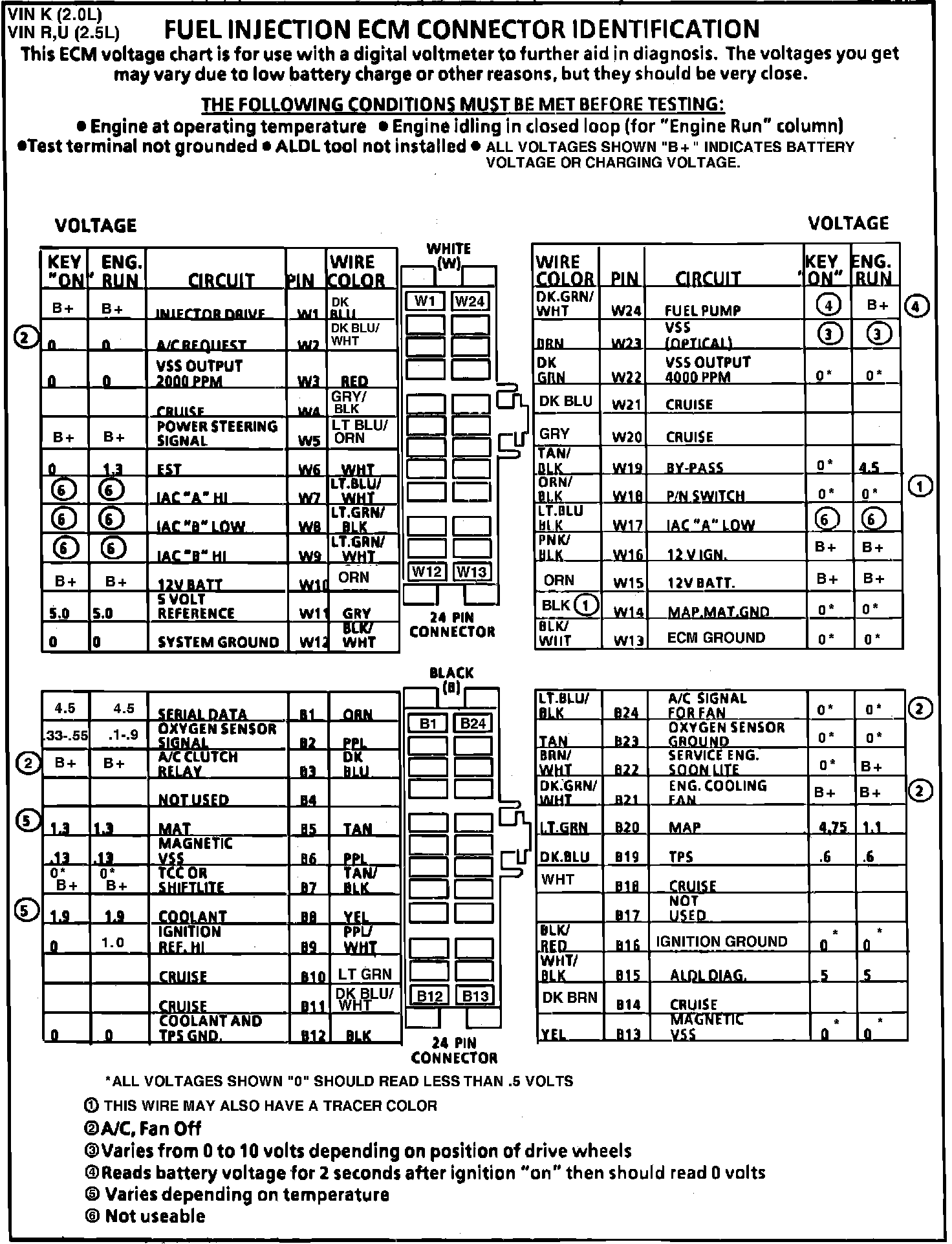 Fig. 013 ECM Connector Terminal I.D. & Volt. Specifications: