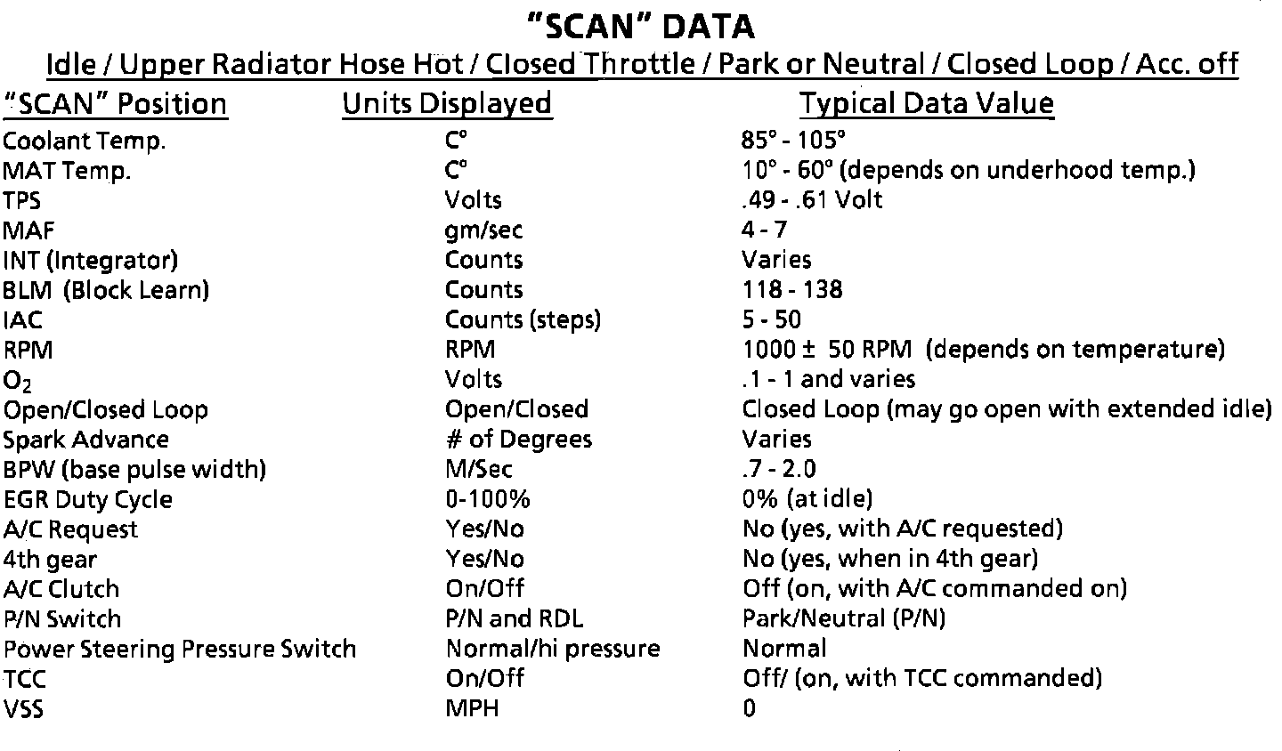 Typical Sensor "Scan" Data Values:
