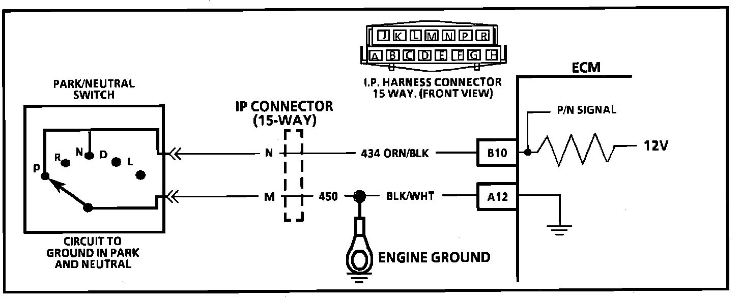 The park/neutral switch contacts are a part of the neutral start switch, and are closed to ground in park or neutral and open in drive ranges. The ECM supplies ignition voltage, through a current limiting resistor, to CKT 434 and senses a closed switch, when the voltage on CKT 434 drops to less than one volt. The ECM uses the P/N signal as one of the inputs to control: