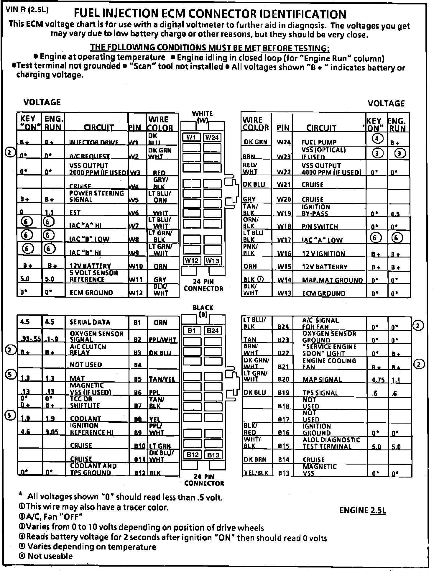 Fig. 019 ECM Connector Terminal I.D. & Volt. Specifications: