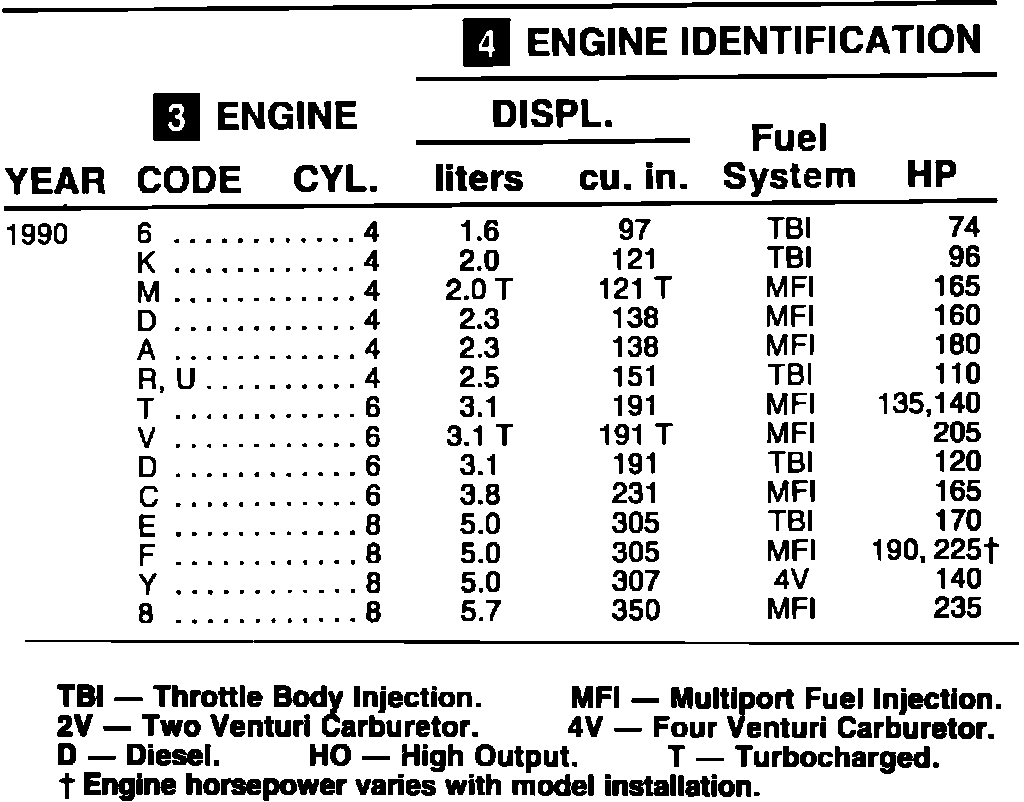 4 - ENGINE IDENTIFICATION: On the line where the engine code appears, read to the right to identify the engine.