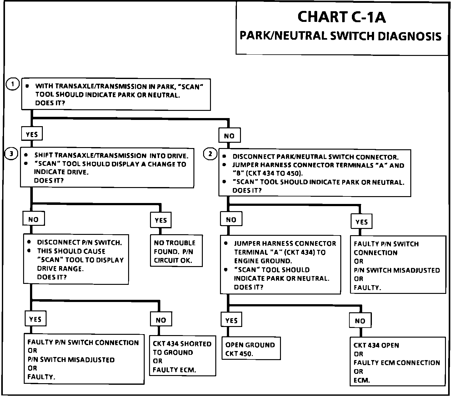 1. Checks for a closed switch to ground in the PARK position. Different makes of "Scan" tools will read PARK/NEUTRAL differently. Refer to operators manual for type of display used for a specific tool.