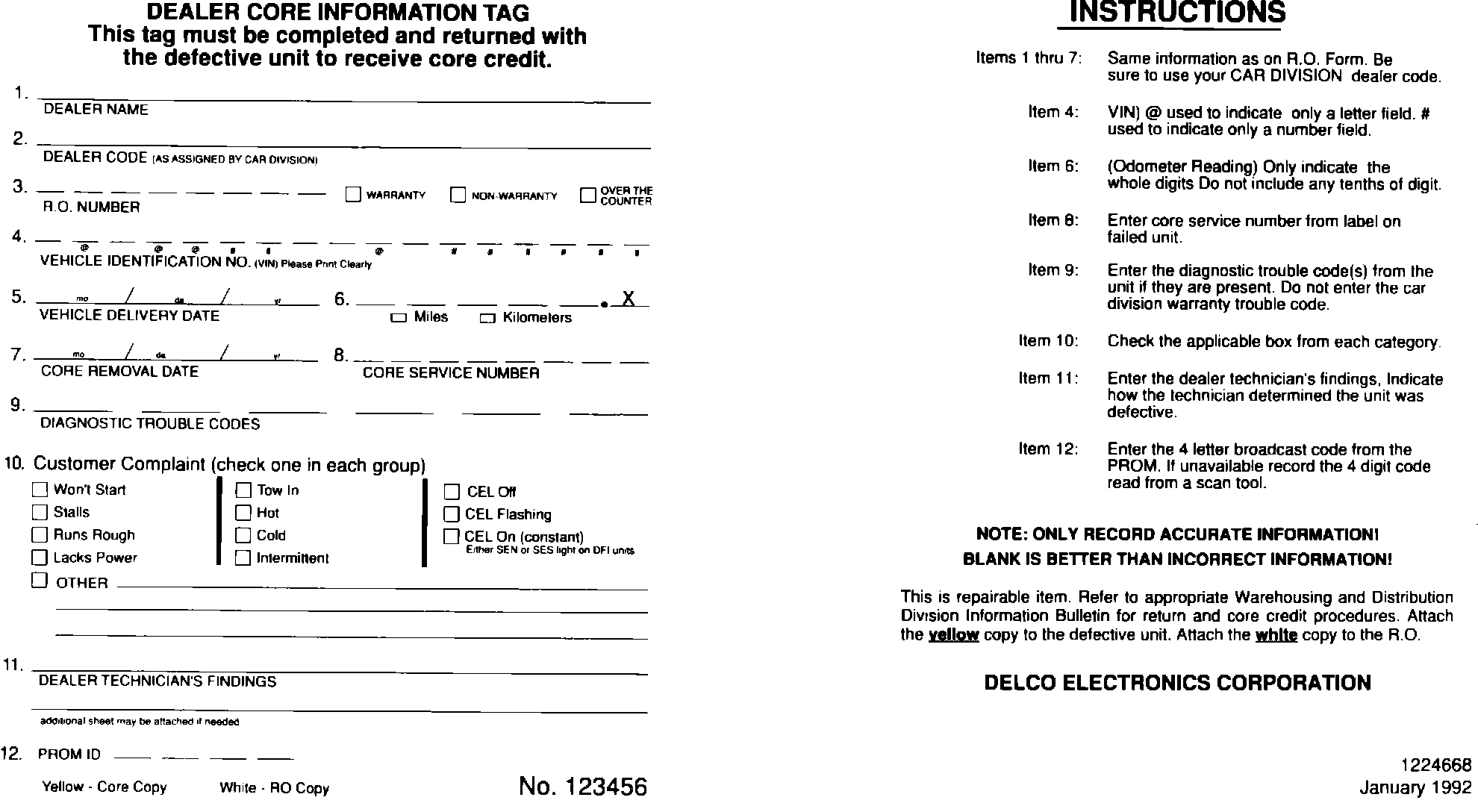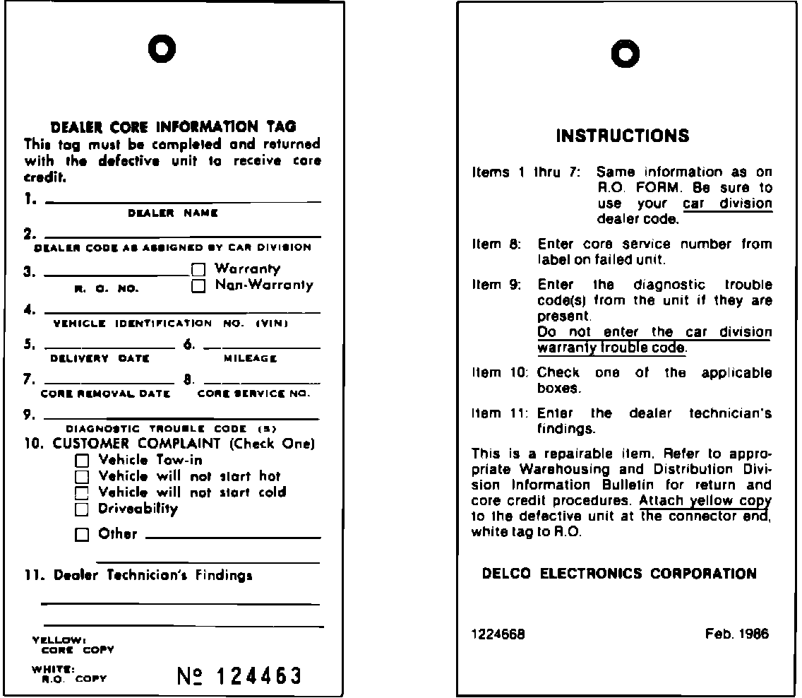 NEW GOVERNMENT REGULATIONS REQUIRE THE REPORTING OF EMISSION CONTROL PRODUCT CONCERNS. SOME OF THE INFORMATION REQUIRED COMES FROM THE TWO-PART PRODUCT RETURN TAG WHICH IS INCLUDED IN THE REMANUFACTURED ECM, PCM AND BCM CONTAINERS. See the example tags on the back of this bulletin (a new style tag will be phased in for 1992). For each unit returned, all areas of the Product Return tag MUST be properly completed. It is very important to describe what led to the replacement of these units (items 10 and 11 on the tag). If more space is needed than that given on the return tag, then include a separate sheet. This information will aid in the correct analysis of each unit and help Pontiac to comply with government regulations. After completion of the tag, the extra copy is to be attached to the scrap copy of the repair order and retained for disposition by the Pontiac Zone Representative.
