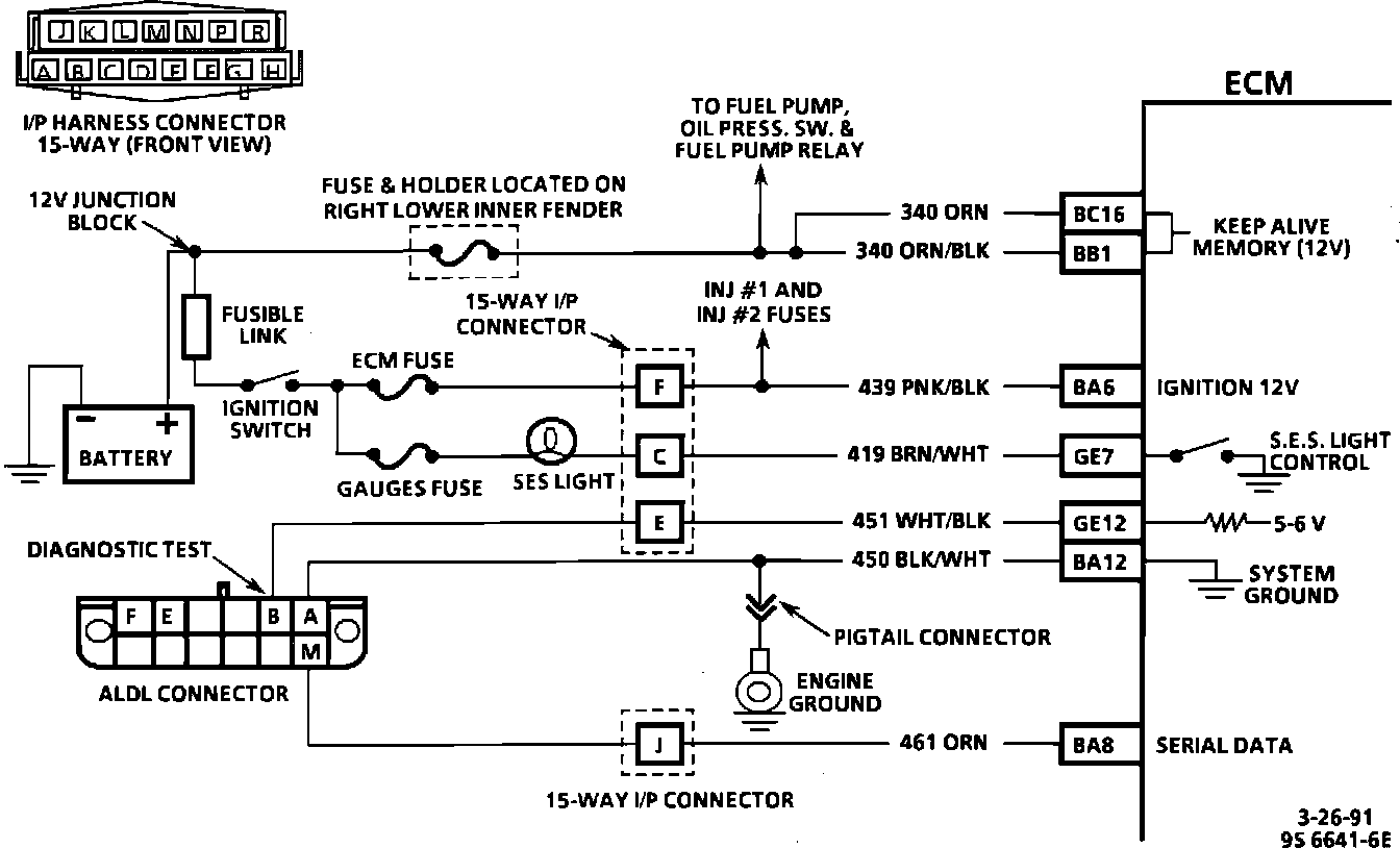3. This test checks the ability of the ECM to control the "SES" light. With the diagnostic terminal grounded, the "SES" light should flash a Code 12 three times, followed by any trouble code stored in memory. A MEM-CAL error may result in the inability to flash Code 12.