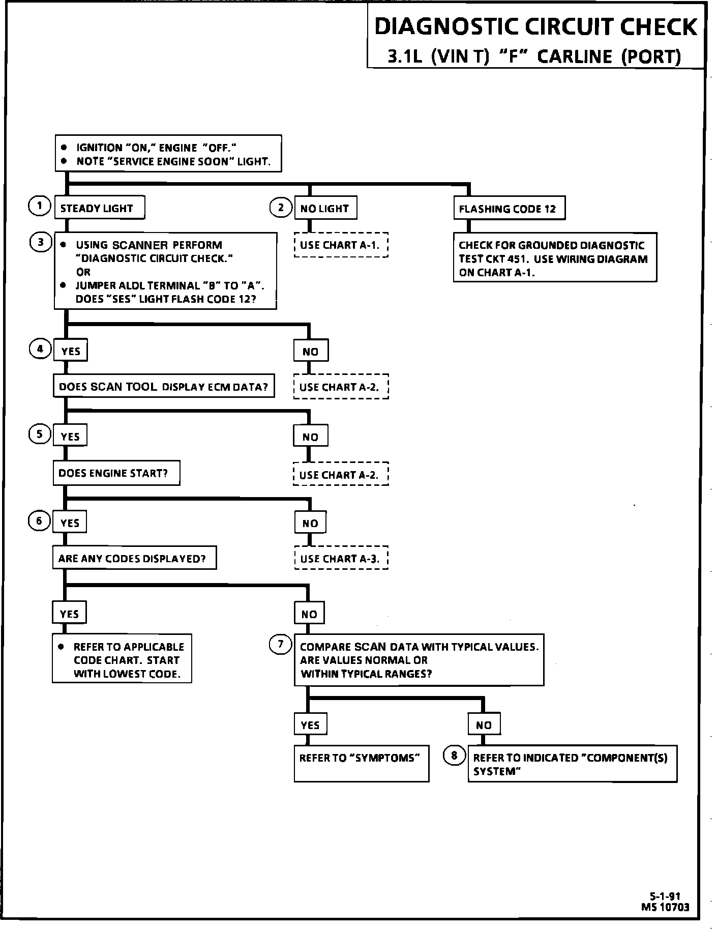 The diagnostic circuit check is an organized approach to identifying a problem created by an Electronic Engine Control System malfunction. It must be the starting point for any driveability complaint diagnosis, because it directs the service technician to the next logical step in diagnosing the complaint. Understanding the chart and using it correctly will reduce diagnostic time and prevent the unnecessary replacement of good parts.