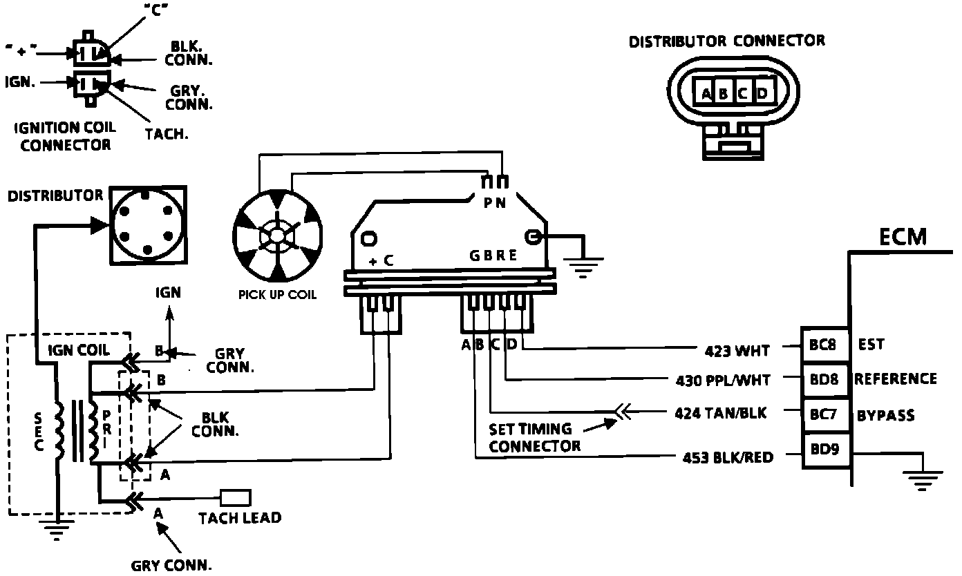 3. Circuit 424 is the bypass circuit. At about 400 rpm the ECM applies 5.0 volts to this circuit to switch spark timing control from the HEI module to the ECM. The wire goes through a connector between the 4-wire connector and the ECM. This is disconnected to set the base timing. An open or grounded bypass circuit will set a Code 42 and the engine will run at base timing, plus a small amount of advance controlled by the HEI module.