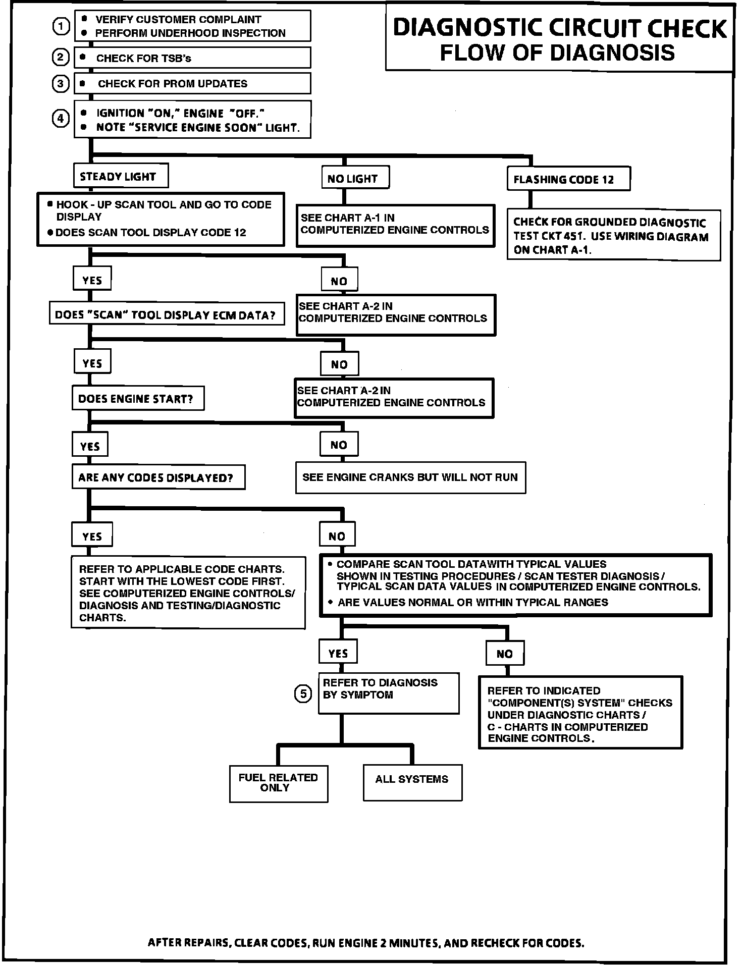 b. Since this is the starting point for all diagnostic procedures or finding the cause of an emissions test failure, always begin here and always follow the flow chart as directed.