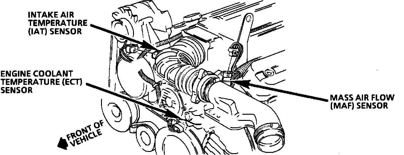 The mass air flow sensor is mounted on air duct, in front of intake manifold.