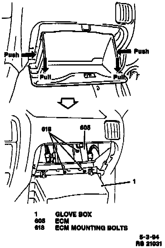 3. Three bolts and PCM bracket from behind glove box.