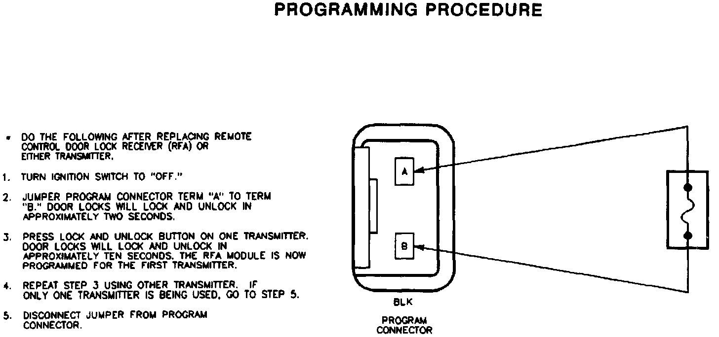 All vehicles with the Remote Keyless Entry option will have the Remote Keyless Entry Module "matched" to the transmitter at the assembly plant. The above procedure is used by service to replace lost transmitters or to program a second transmitter.