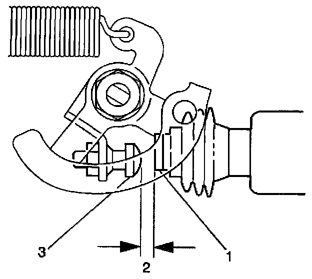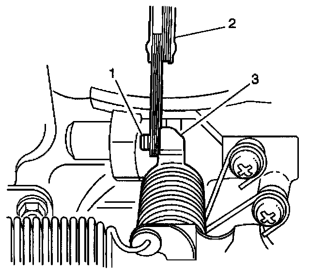 3. Inspect the ISC motor plunger. If the ISC motor plunger (1) is contacting the throttle lever screw (3). then the engine must be brought to operating temperature. There must be no contact (2) between the ISC motor plunger and the throttle lever screw.