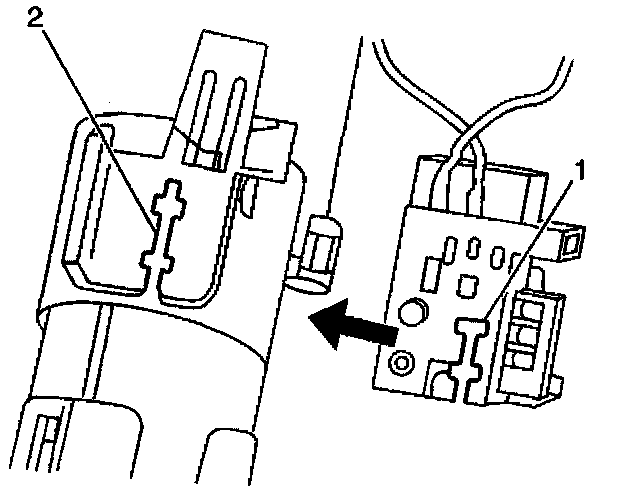 1. Insert the locating tab (1) on the fuel level sensor assembly into the channel (2) on the fuel sender assembly and slide upward until locked in place.