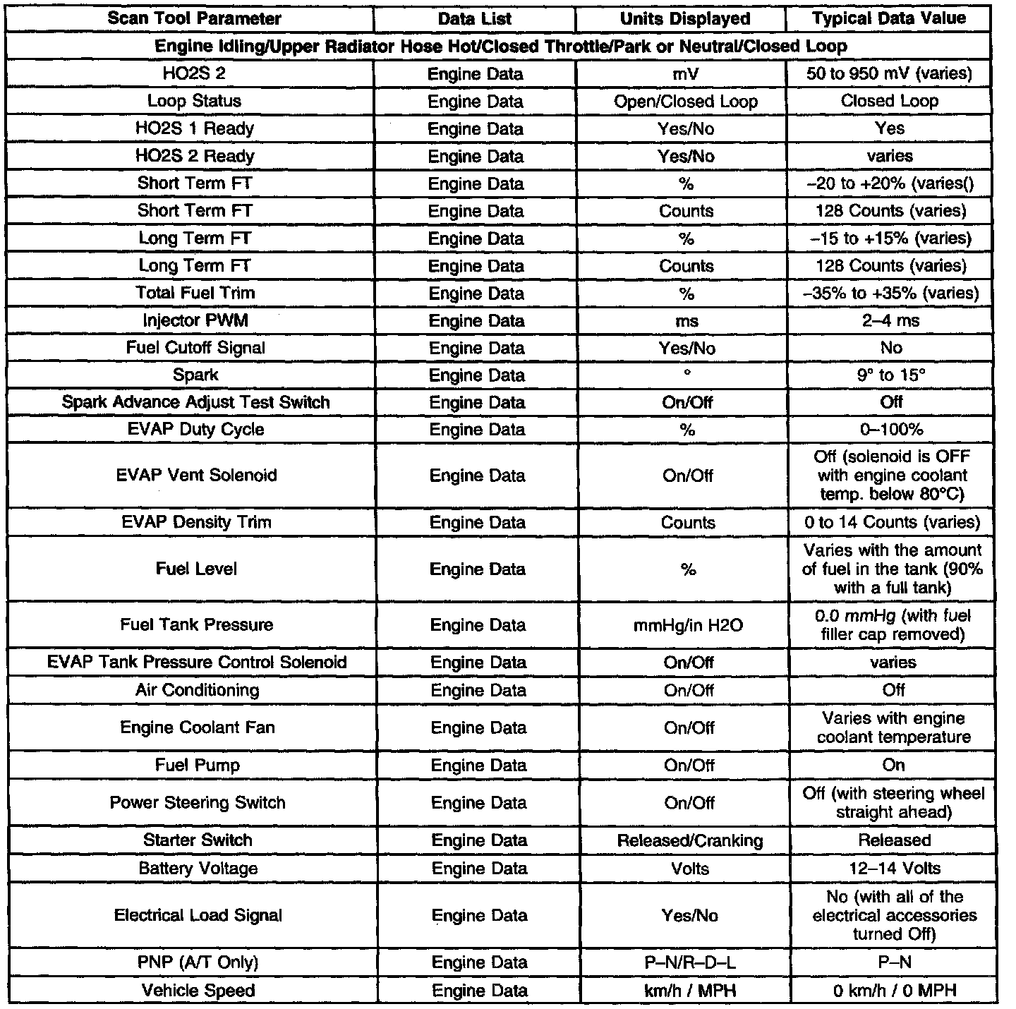 The scan tool data parameters listed below are the only parameters referenced in this service manual for use in diagnosis. If all scan tool data values are within the typical ranges described below, refer to Symptoms for additional diagnosis.