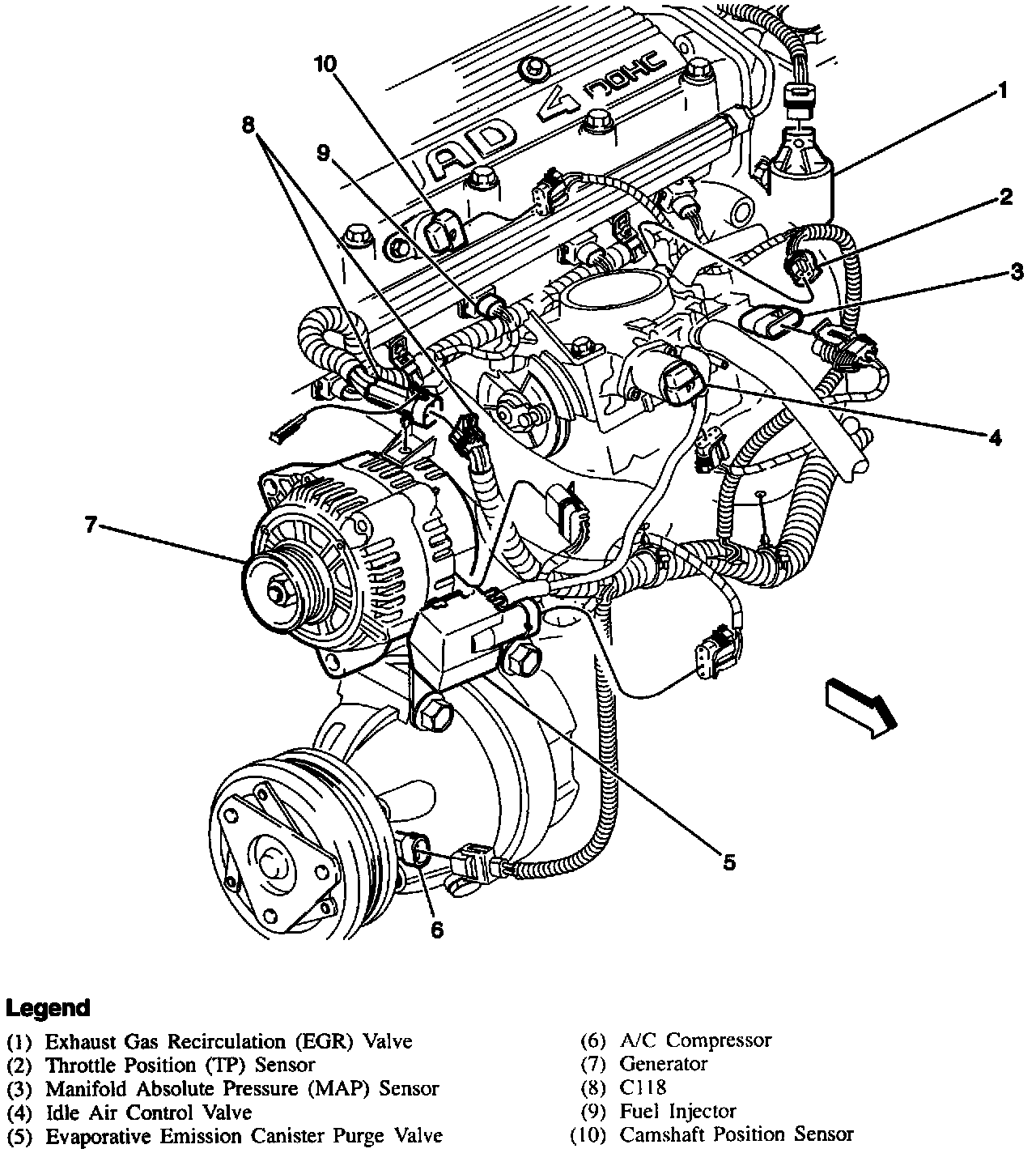 On the top RH side of the engine