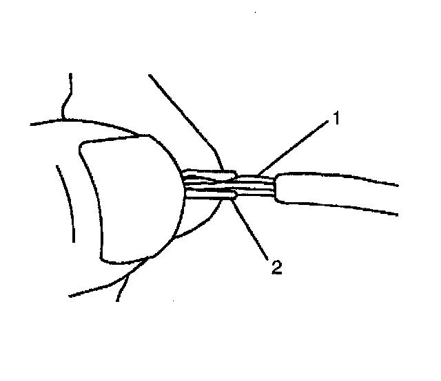 7. Center the splice clip (2) over the stripped wires (1) and hold the clip in place.