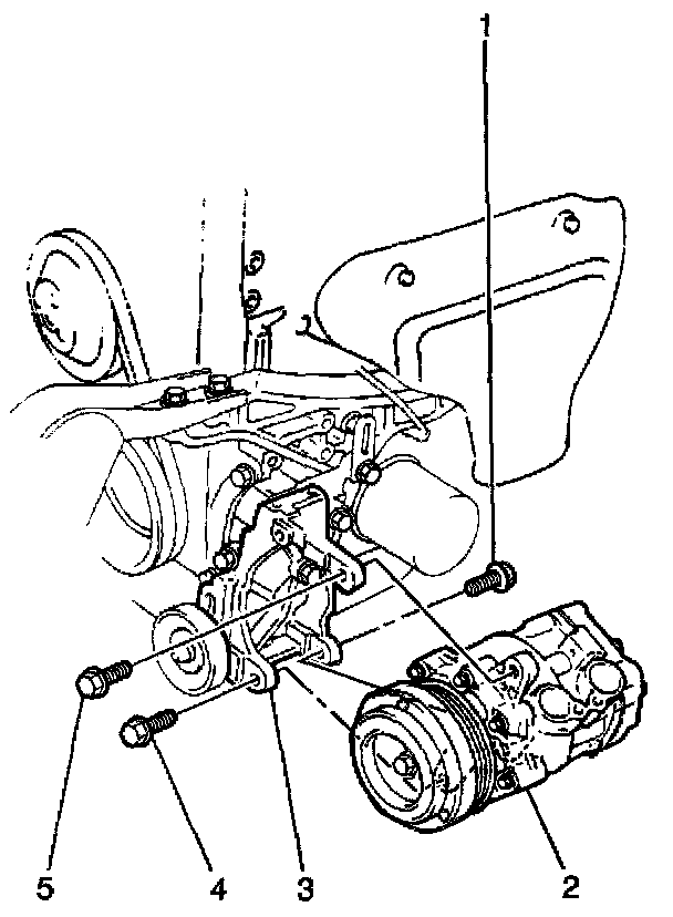 11. Remove the 3 bolts (1,4,5) and the compressor from the vehicle.