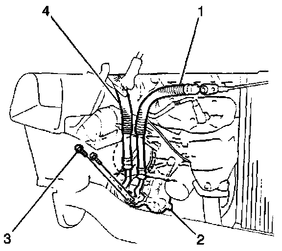 8. Remove 1 bolt (3) and the discharge hose (1) from the compressor.