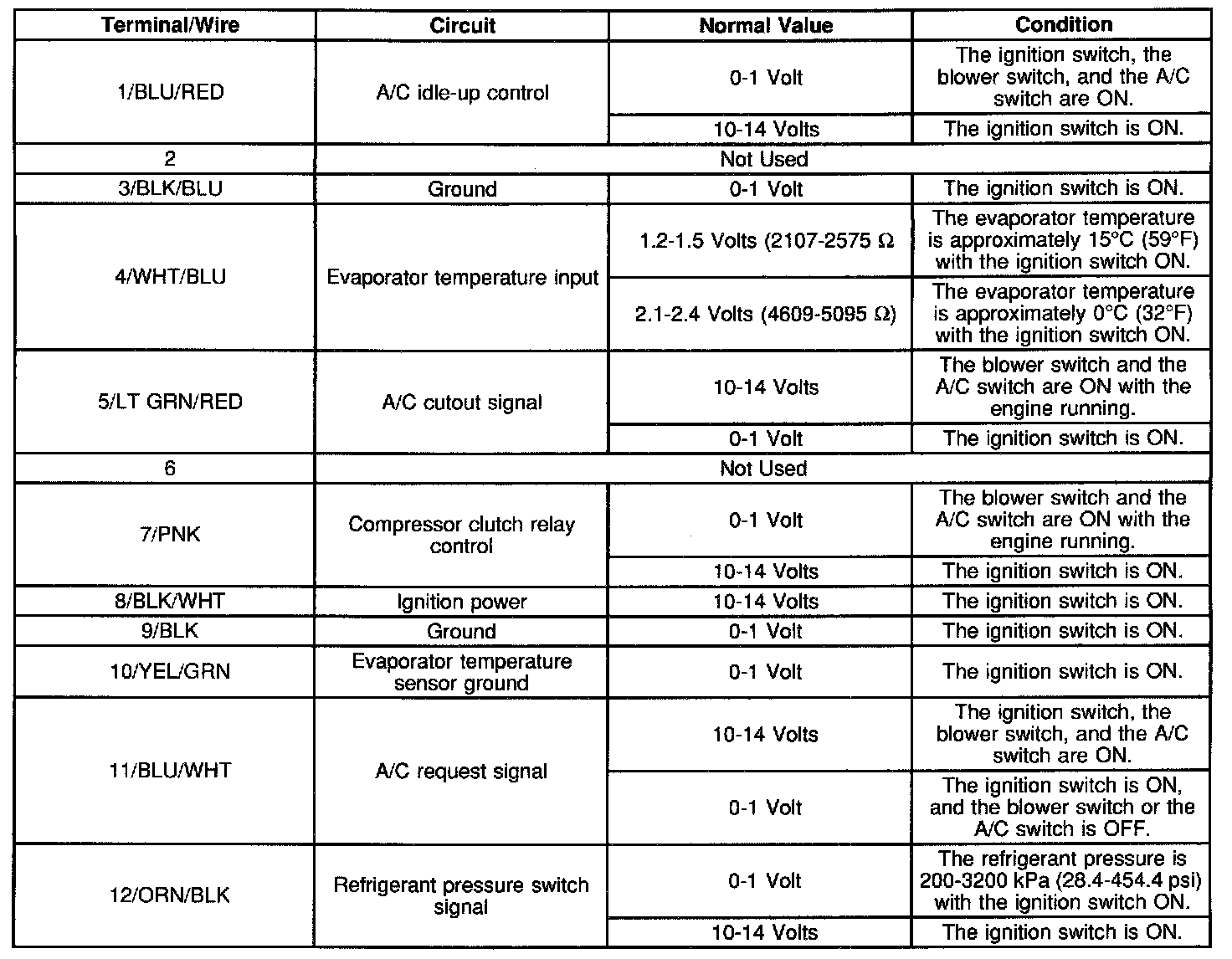 Compressor Control Module Voltage Table: