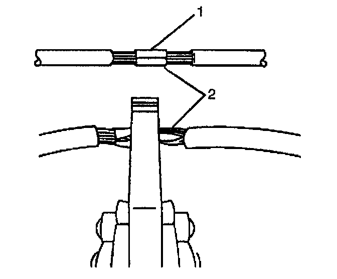 7. Center the splice clip (2) over the stripped wires (1) and hold the clip in place.