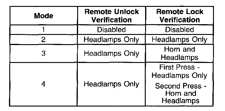 2. Turn the ignition to the ACC position. The seat belt telltale flashes and the chime bongs 1-4 times, equal to the current customization mode. This indicates which mode the vehicle is in. Each time the transmitter LOCK button is pressed, the mode number advances. A transition past mode 4 will repeat, starting again at mode 1.