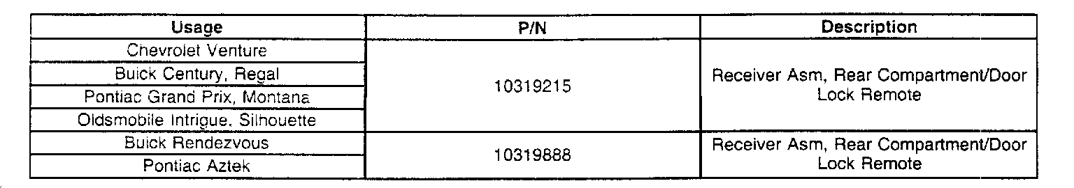 Home >> Pontiac >> 2001 >> Aztek V6-3.4L VIN E >> Repair and Diagnosis >> Body and Frame >> Locks >> Keyless Entry >> Keyless Entry Receiver >> Technical Service Bulletins >> Customer Interest >> Remote Keyless Entry - Not Functioning Properly