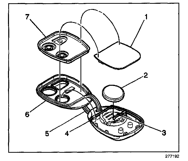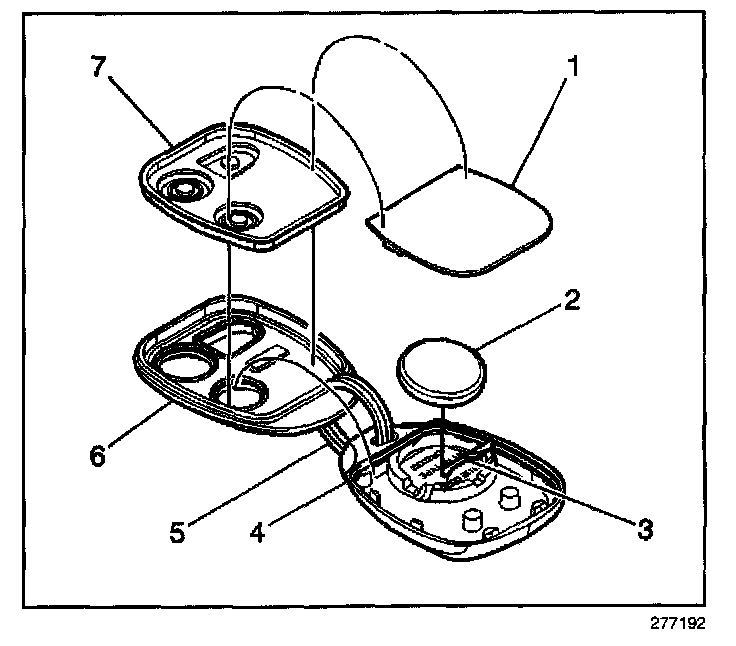 1.1. Insert a small flat-bladed tool between the 2 halves of the transmitter case (6,4) at the slot provided near the key ring hole (5).