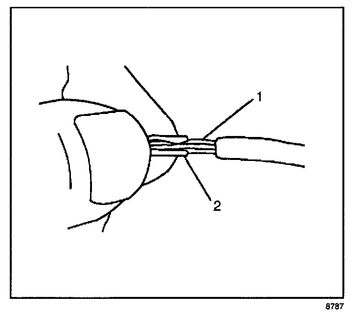 7. Center the splice clip (2) over the stripped wires (1) and hold the clip in place.