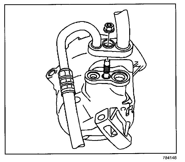 ^ If the amount of old oil drained is less than or equal to 75 ml (2.5 oz), add 75 ml of new oil into the new compressor through the crankcase bolt hole.