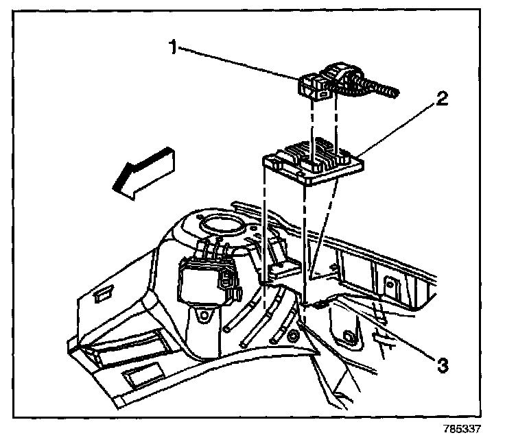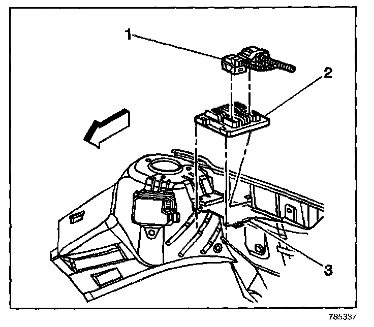 1. Push the PCM (2) into the PCM bracket (3). The retaining tab will lock in place.