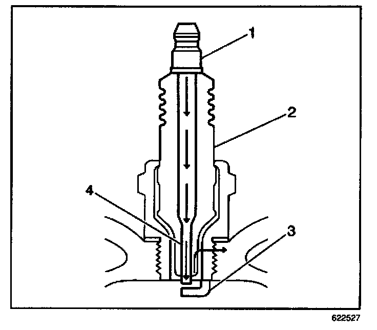 ^ Inspect the insulator (2) for cracks. All or part of the electrical charge may arc through the crack instead of the electrodes (3, 4).