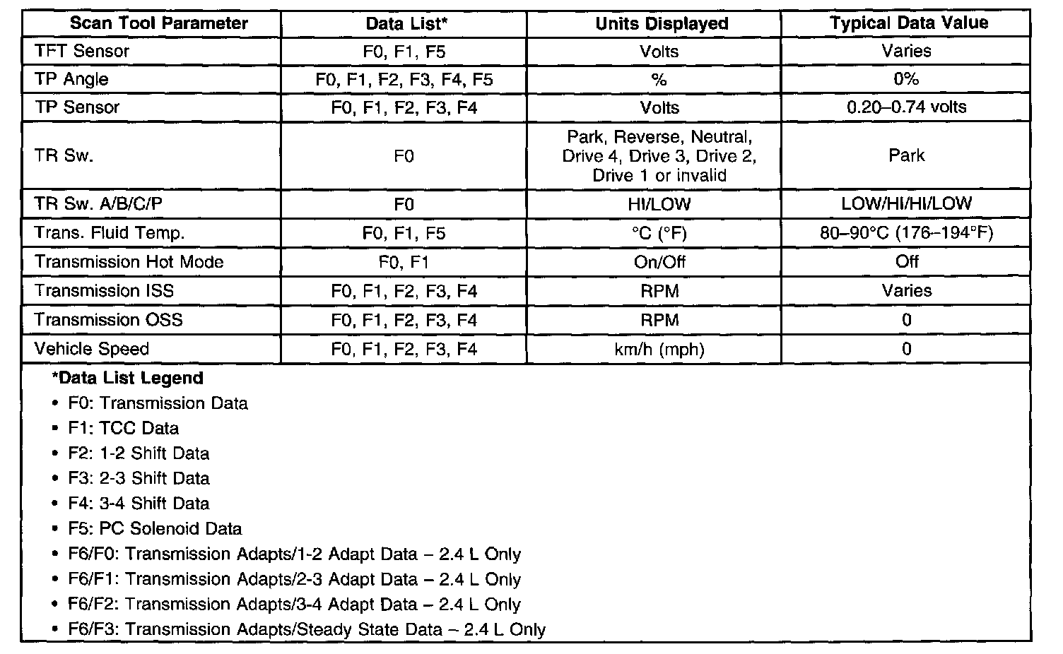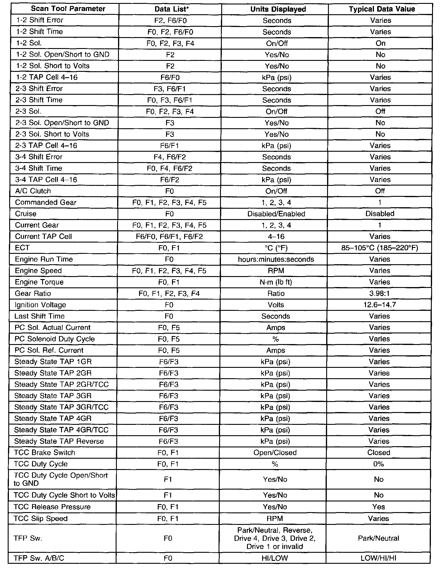 Home >> Pontiac >> 2002 >> Sunfire L4-2.2L VIN F >> Repair and Diagnosis >> Powertrain Management >> Transmission Control Systems >> Testing and Inspection >> Scan Tool Data List