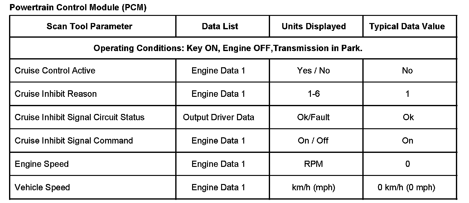 Powertrain Control Module (PCM) Scan Tool Data List: