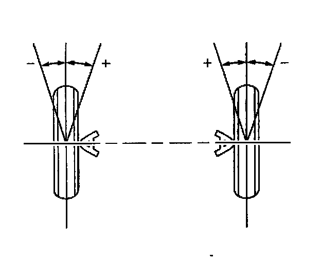 Camber is the tilting of the wheels from the vertical when viewed from the front of the vehicle. When the wheels tilt outward at the top, the camber is positive (+). When the wheel tilts inward at the top, the camber is negative (-). The amount of tilt is measured in degrees from the vertical. Camber settings influence the directional control and the tire wear.