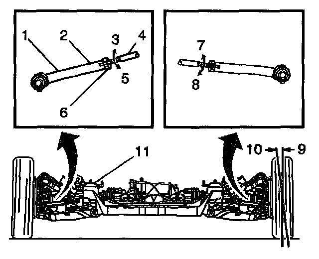 1. Loosen the jam nut (6) at the rear wheel tie rod.
