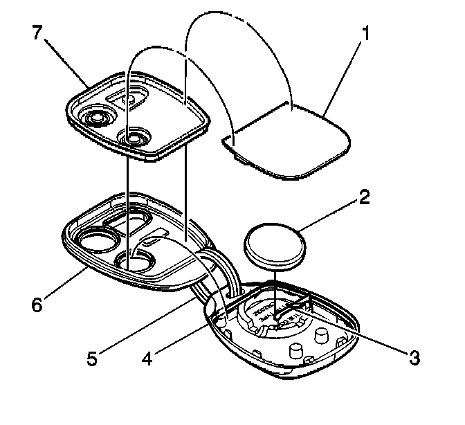 1. Insert a small flat-bladed tool between the 2 halves of the transmitter case (6,4) at the slot provided near the key ring (5) hole.