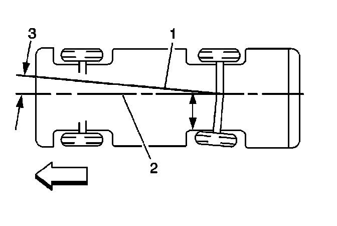 In the illustration, toe-in is shown on the left rear wheel, moving the thrust line (1) off center. The resulting deviation from the centerline is the thrust angle.