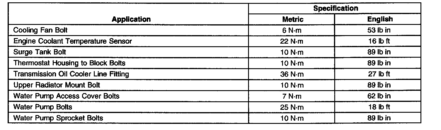 ENGINE COOLING / Fastener Tightening Specifications: