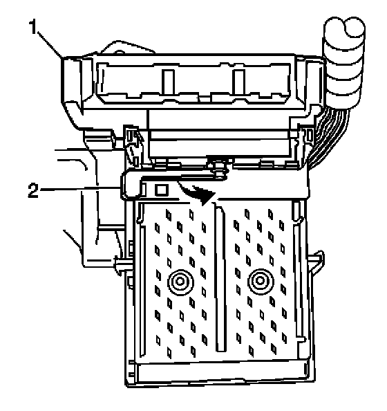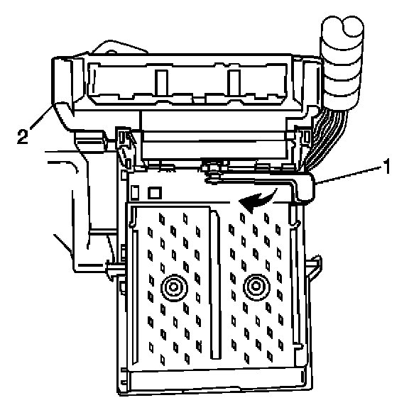 2. Rotate the BCM retaining lever (2) to secure the BCM to the console accessory wiring junction block.