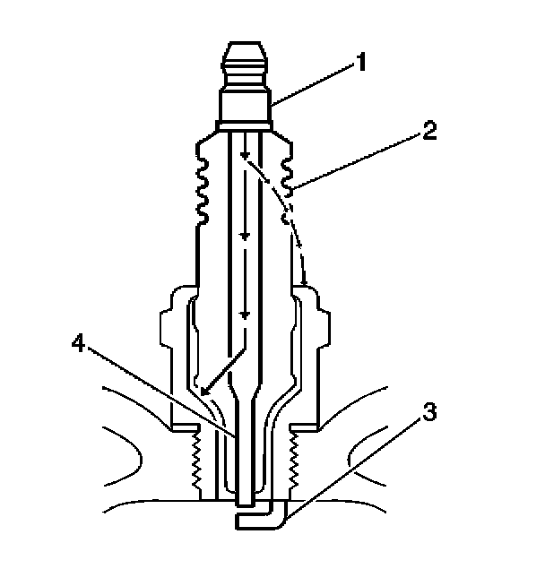 - Inspect the insulator (2) for cracks. All or part of the electrical charge may arc through the crack instead of the electrodes (3, 4).
