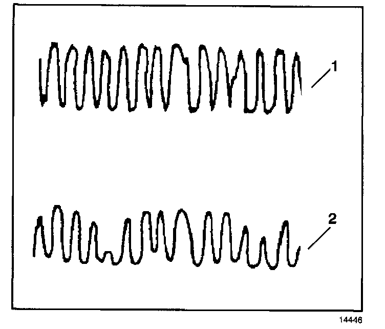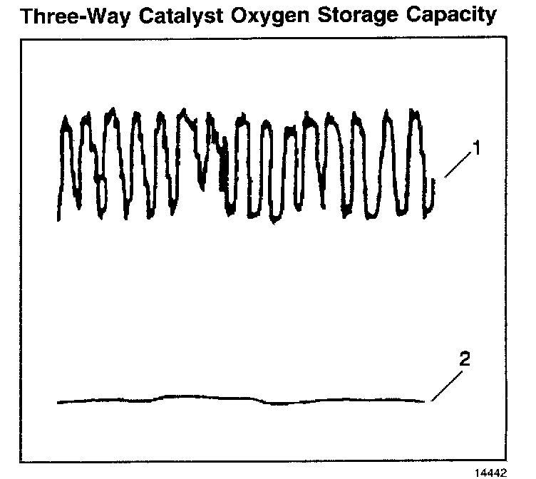 The PCM must monitor the three-way catalyst system (TWC) for efficiency. In order to accomplish this, the PCM monitors the pre-catalyst and post-catalyst oxygen sensors. When the TWC is operating properly, the post-catalyst (2) oxygen sensor will have significantly less activity than the pre-catalyst (1) oxygen sensor. The TWC stores oxygen during its normal reduction and oxidation process. The TWC releases oxygen during its normal reduction and oxidation process. The PCM calculates the oxygen storage capacity using the difference between the pre-catalyst and post-catalyst oxygen sensor's voltage levels.