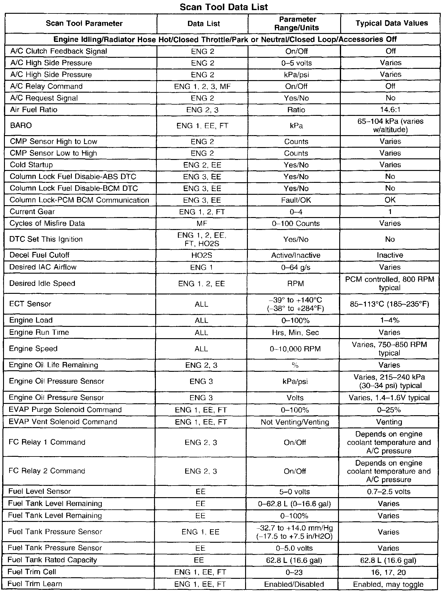 The Engine Scan Tool Data List contains all engine related parameters that are available on the scan tool. The list is arranged in alphabetical order. A given parameter may appear in any one of the data lists, and in some cases may appear more than once, or in more than one data list in order to group certain related parameters together.