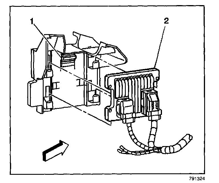 1. Slide the PCM into the PCM bracket. The retaining tab (1) will look in place.