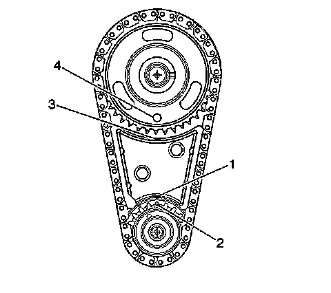 Align the timing mark on the camshaft gear (4) with the timing mark on top of the timing chain dampener (3).