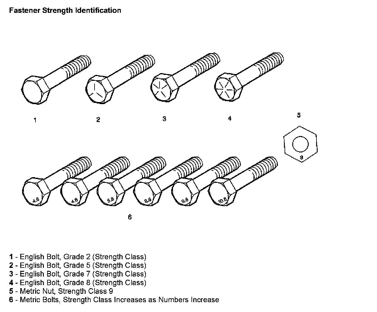 The most commonly used metric fastener strength property classes are 9.8 and 10.9. The class identification is embossed on the head of each bolt. The English, inch strength classes range from grade 2 to grade 8. Radial lines are embossed on the head of each bolt in order to identify the strength class. The number of lines on the head of the bolt is 2 lines less than the actual grade. For example, a grade 8 bolt will have 6 radial lines on the bolt head. Some metric nuts are marked with a single digit strength identification number on the nut face.