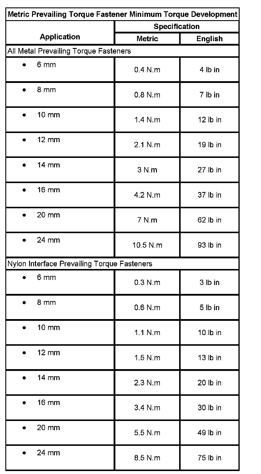 Metric Prevailing Torque Fastener Minimum Torque Development: