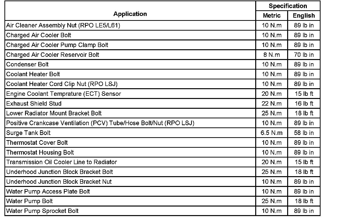 Fastener Tightening Specifications: