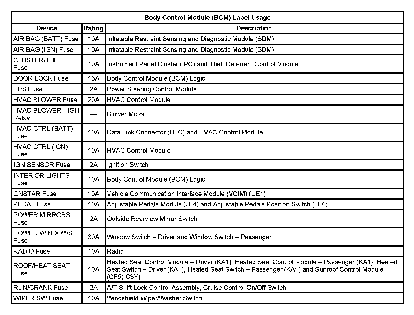 Body Control Module (BCM) Label Usage: